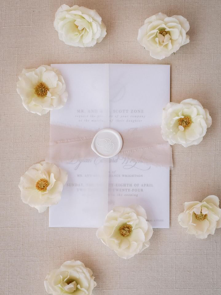 Simply Elegant! That was the theme of this gorgeous wedding suite. This custom suite included speciality color letterpress foil printing, a custom illustration for the reception card, a vellum wrap accompanied by a custom died silk ribbon and monogrammed wax seal, and a beautiful metallic floral (a nod to the bride’s wedding dress) designed envelope liner. All guaranteed to make statement right out of the envelope!