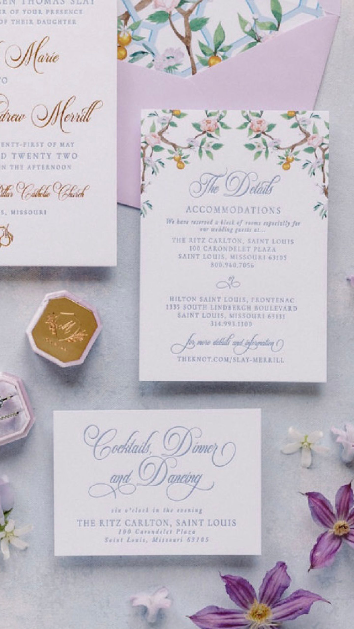 I LOVE when clients come to ACD with a very specific design in mind. With Kayla and David, they knew from the beginning that the oranges and the purple flowers were to be a very important part of the suite. They also wanted pops of chinoiserie style throughout. We first started with the custom pattern that in parts made it ways on to the Save the Date, then the envelope liner and then small parts on the details and reception cards. Featuring gold foil throughout and French blue letterpress printing, the custom monogram was the perfect finishing touch. All of these touches, were then carried over into the day-of items — with a few additions of their fur babies!!!