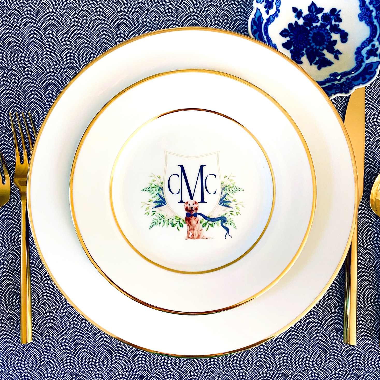 Since their puppy was very red in color and a boy, Mary and I agreed it would be fun to add a touch of whimsy with the bow tie and a flowing ribbon. We also wanted something that was fundamentally them, but would also not go out of style. Mary had asked me if we could then take the monogram and put it on china. Thanks to her, the ACD line of custom gold rimmed china was born!